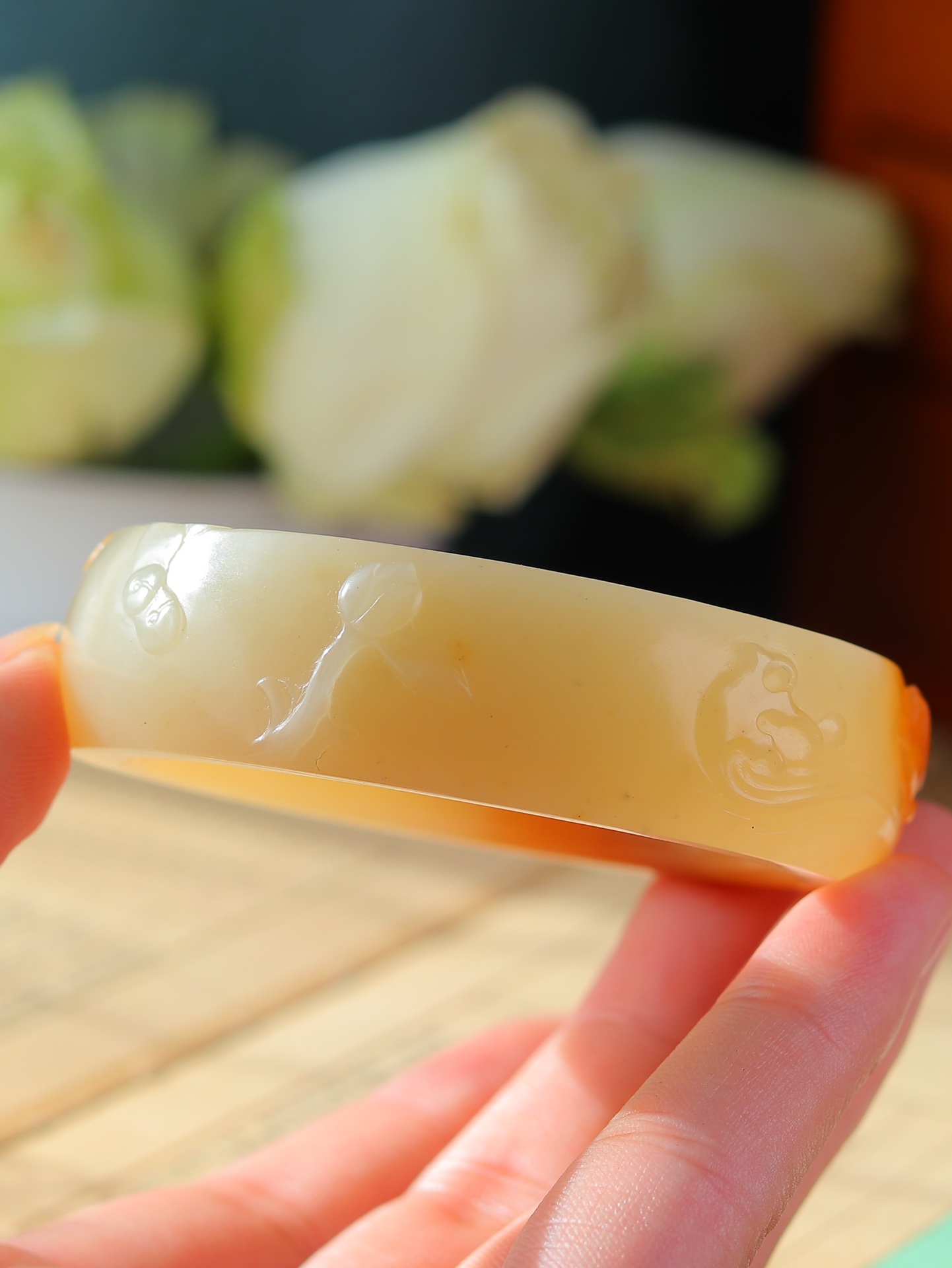 新疆且末糖白连年有余手镯,肉眼不见结构,打灯结构细腻均匀,玉质温润白洁,油性十足,糖色干净,端庄典雅